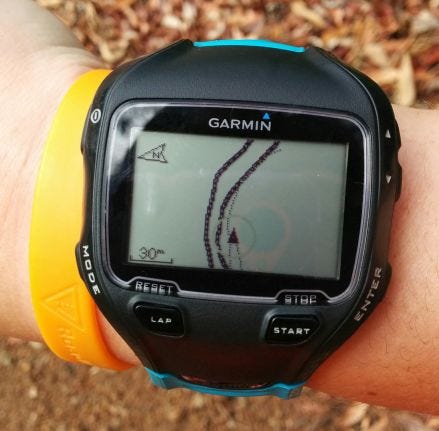 This is the problem with the Courses maps screen on Garmin - it doesn't have navigation instructions, just the course marking. If you're on an out-and-back course, or the path loops back on itself, you can't really tell which one you should take. You don't get an indicator that says "take this bit first, not that one". You just get two lines. So when we descended and got to a point where it looked like a small rockslide, we should have taken the rockslide. As it was, we went right, and carried on, inadvertently running out and doing the finish of the course. That particular bit went down and then up, like the course description had said, but it turns out that it didn't go nearly as far down and nearly as far up, and once we'd realised that while we were clearly on the Qi Gong course we must have gone wrong, we were too far in to bother to retrace our steps and start again. The middle of the course to the aid station turnaround and then to the finish is lovely easy trail, with the only sour note going through a section of the Wungong Regional Park that had been burnt out by bushfire.