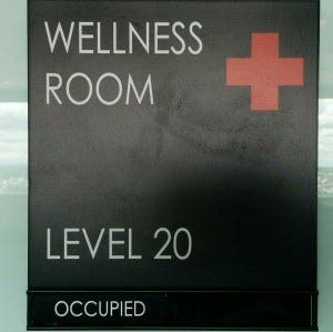 The room looks like all of our glass offices, but the Wellness Room glass has a floor to ceiling opaque coating. It has a bed and a small sink and gets used by new mums who are still breastfeeding and need a place to express breastmilk. It's got a little mini fridge, a full length mirror, one of the firm's first aid kits and the defibrillator hangs on the wall.