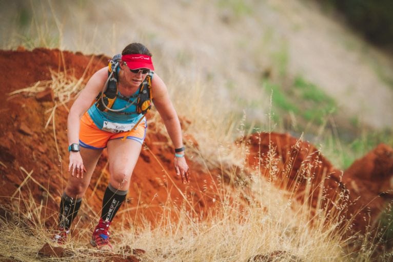 At the end of the race I sat with a few people waiting for Jeremy to arrive back, and we were discussing The Three Steps, and Felix said he thought that it was harder than The Escalator on Six Inch, and I'd have to agree, it's just that The Escalator is 34km into a race, instead of 6.5km in. With The Three Steps you've just gone up for four kilometres, and then barrelled down a hill, turned right and then right again as you go past the abandoned farmhouse. Once past the house you look up to see human shaped tiny specks going up this ridiculous hill. You get further up the hill, and then you hit the worst part. I'd seen people go past me as I'd made my way down the 2 km descent who looked fairly dusty and when I came across Dale-Lyn Russell she told me I was far too clean looking for this race and gave me a big hug and transferred a heap of muck onto me. As I continued down the hill I looked back at Dale-Lyn scrambling up and yelled out "What did you do? Your shorts!" and she yelled back "I had to get down somehow, so I came down on my bum!" Her shorts fabric wasn't visible underneath a mass of red and brown dirt.